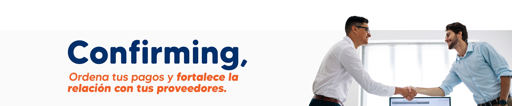 El Confirming es una solución que te permite pagar a tus proveedores a través de una entidad financiera, de forma rápida, sin afectar tu flujo de caja, obteniendo descuentos por pronto pago, credibilidad y confianza con el proveedor.